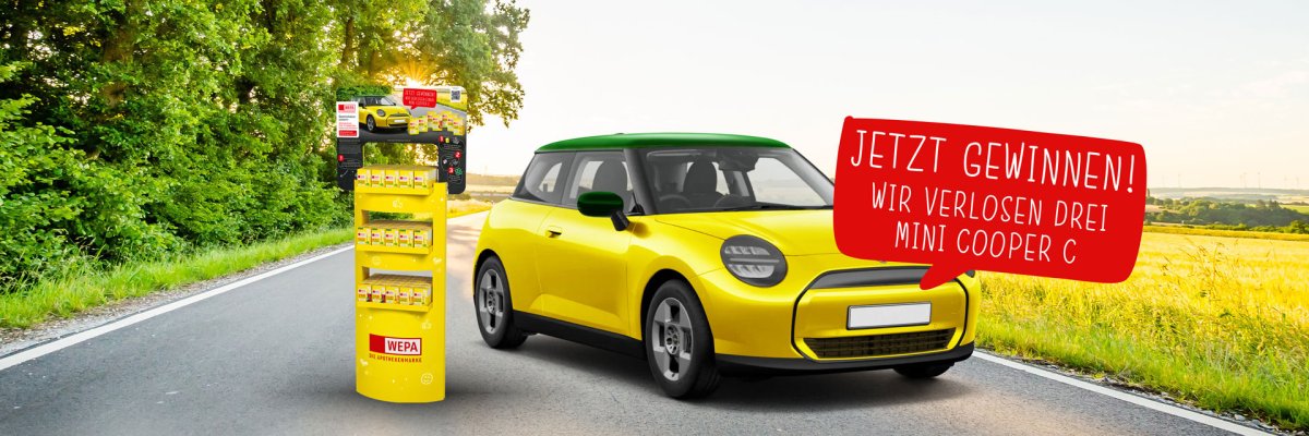 Mit dem Kauf eines WEPA Getränke Bodenaufstellers erhalten Sie die Gewinnchance auf einen von drei MINI Cooper C, personalisiert mit ihrem Apotheken-Logo auf der Motorhaube und Heckscheibe. (Teilnahmekarte liegt der Bestellung bei.)
